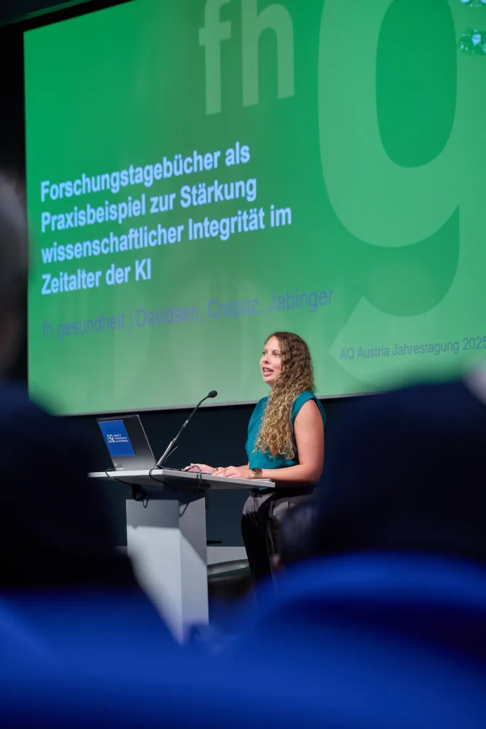 Simone Davidsen, Wissenschaftliche Mitarbeiterin im Studiengang Qualitäts- und Prozessmanagement im Gesundheitswesen, FHG – Zentrum für Gesundheitsberufe Tirol präsentierte im Track Konkrete Einblicke in den Umgang mit künstlicher Intelligenz (KI) unseren Beitrag zum Thema Forschungstagebücher als Praxisbeispiel zur Stärkung wissenschaftlicher Integrität im Zeitalter der KI.